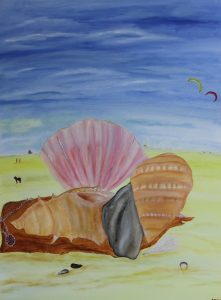 Dit schilderij staat voor een mooie zomerdag aan het strand, de een laat zijn hond uit, de ander is aan het kitesurfen en weer een ander is aan het jutten….